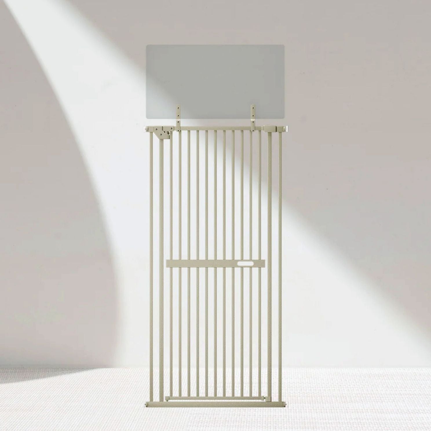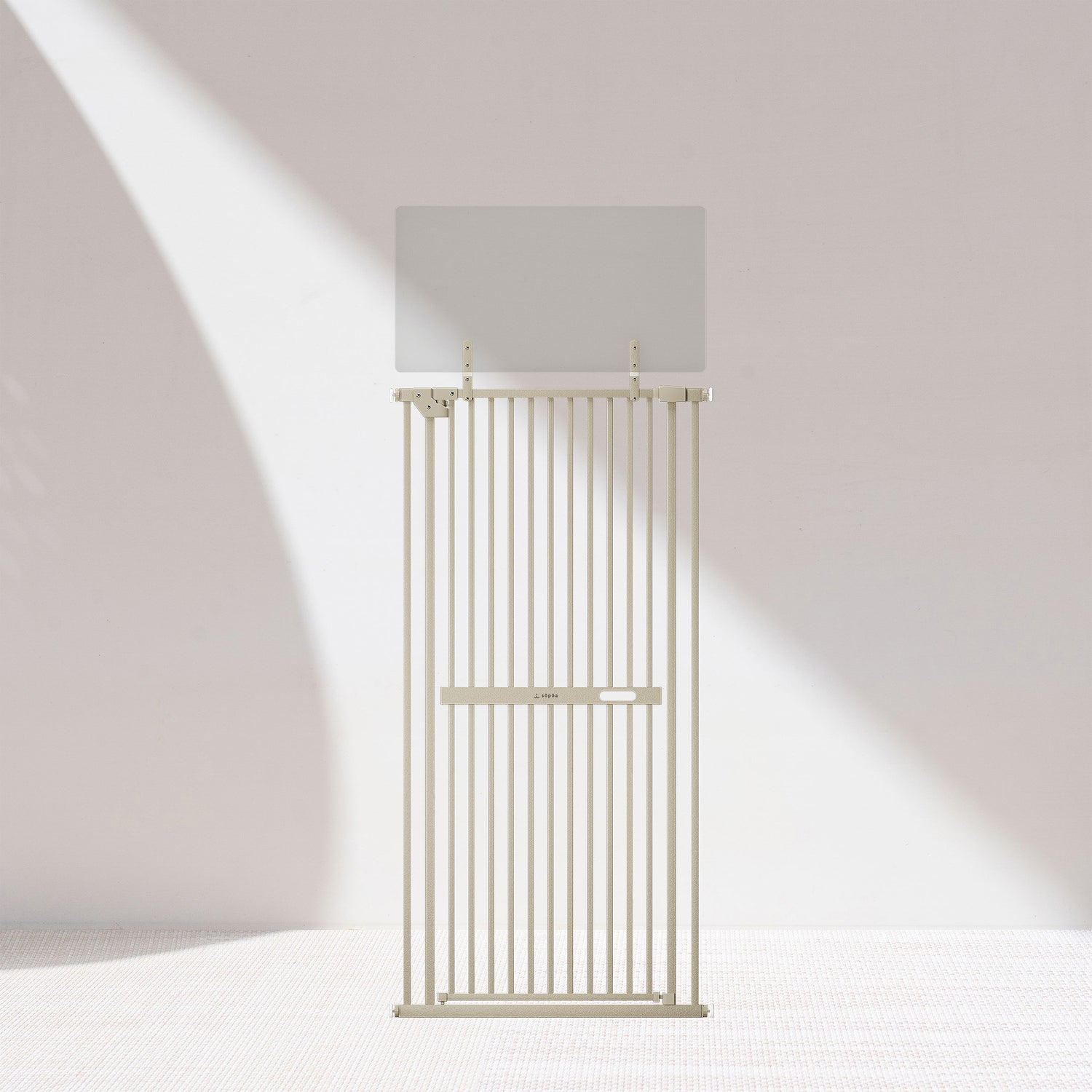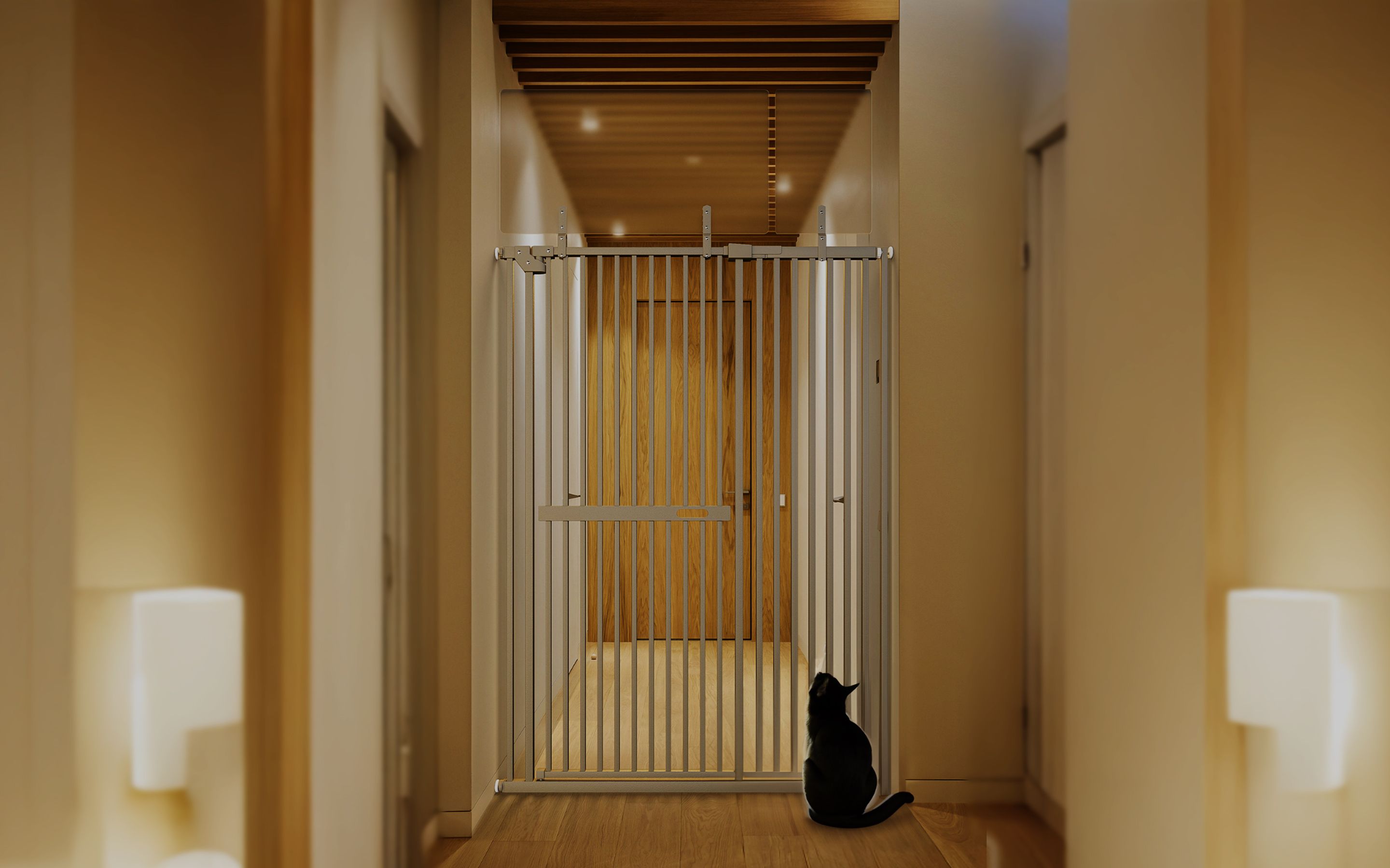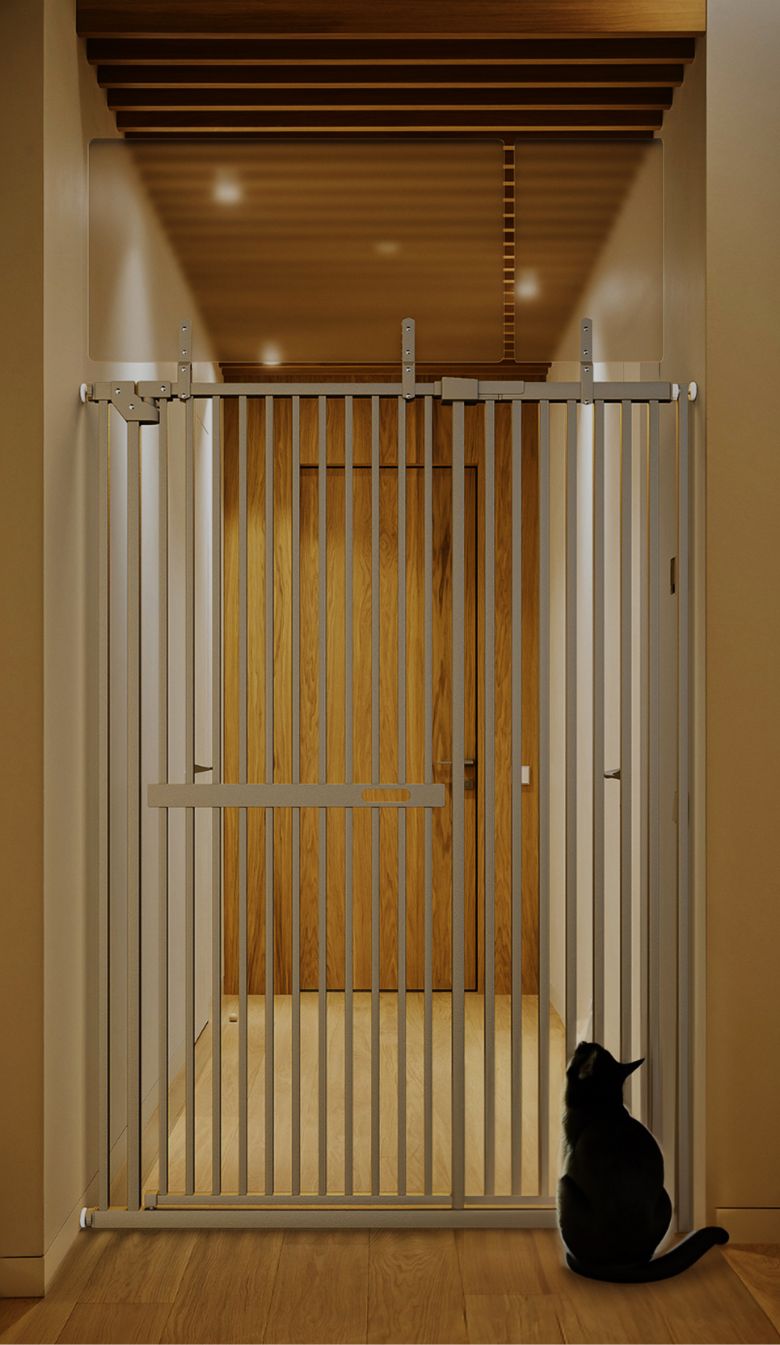 高さ190cmの実用新案設計で飛び越え防止。隙間3.7cm以下で子猫も安心。半透明パネルのインテリアに馴染むデザイン、片手静音ロック付き。横突っ張り式・安定設計。